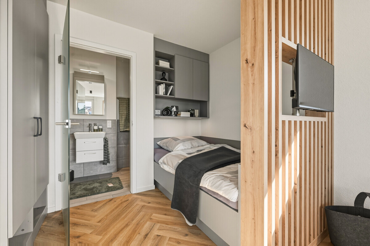 Im Wohn- und Schlafbereich erwartet dich ein gemütliches Bett mit einer großzügigen Liegefläche (1,20 x 2,00 m). Clevere Einbauschränke und Regale bieten dir ausreichend Platz für deine persönlichen Dinge. Ein bequemer Sessel sowie ein moderner Multi-Media-Bildschirm sorgen für entspannte Stunden nach einem langen Tag. Die kompakte Küchenzeile ist mit einem Herd, Spülbecken, Spülmaschine, Kühlschrank und Backofen voll ausgestattet. Angrenzend befindet sich ein separater Ess- und Arbeitsbereich – perfekt zum Arbeiten oder für gemütliche Mahlzeiten. Das innenliegende Badezimmer punktet mit einer stilvollen Ausstattung: bodentiefe Regendusche, modernes Waschbecken mit Spiegel und zusätzliche Badmöbel für mehr Komfort.