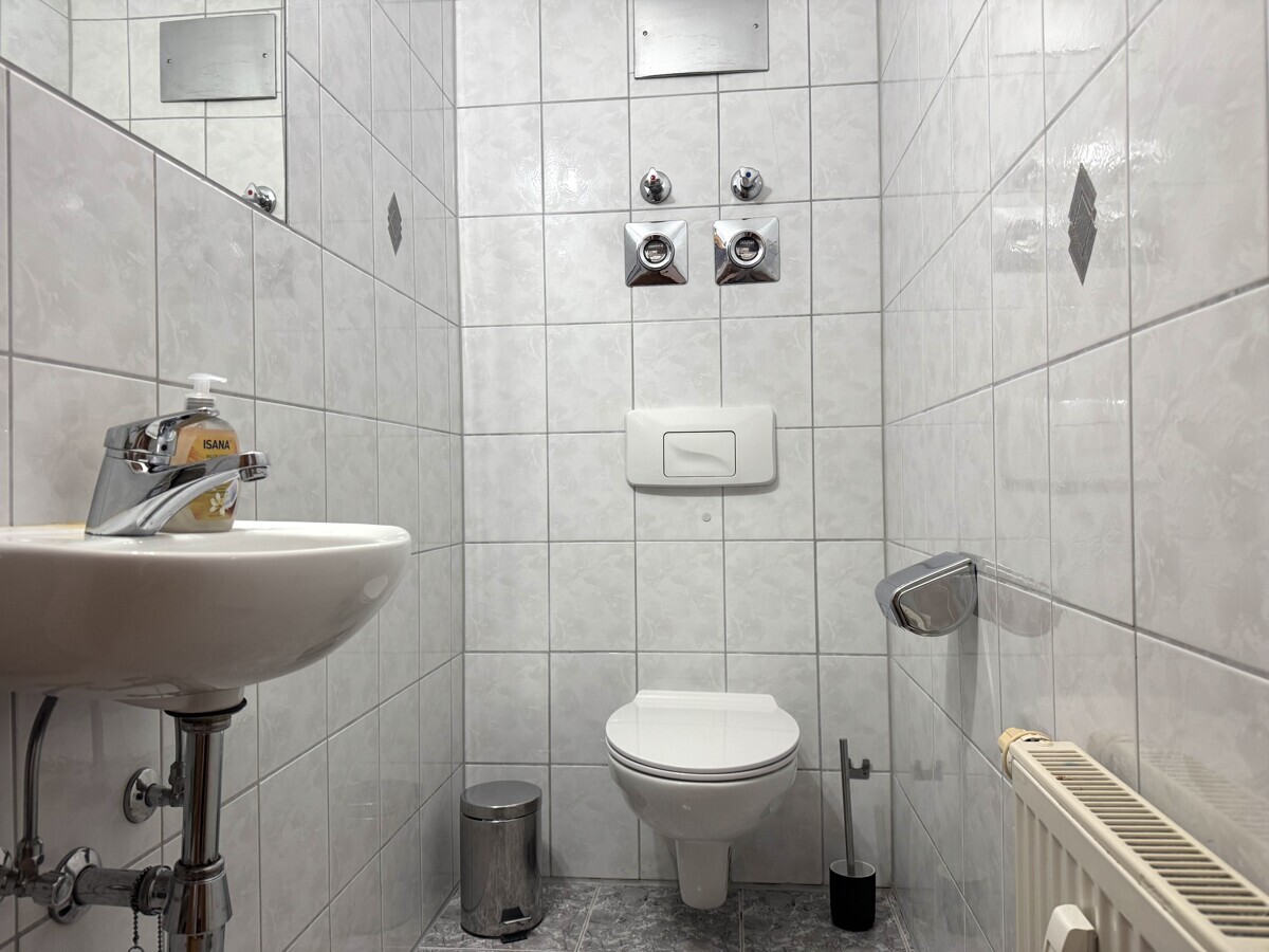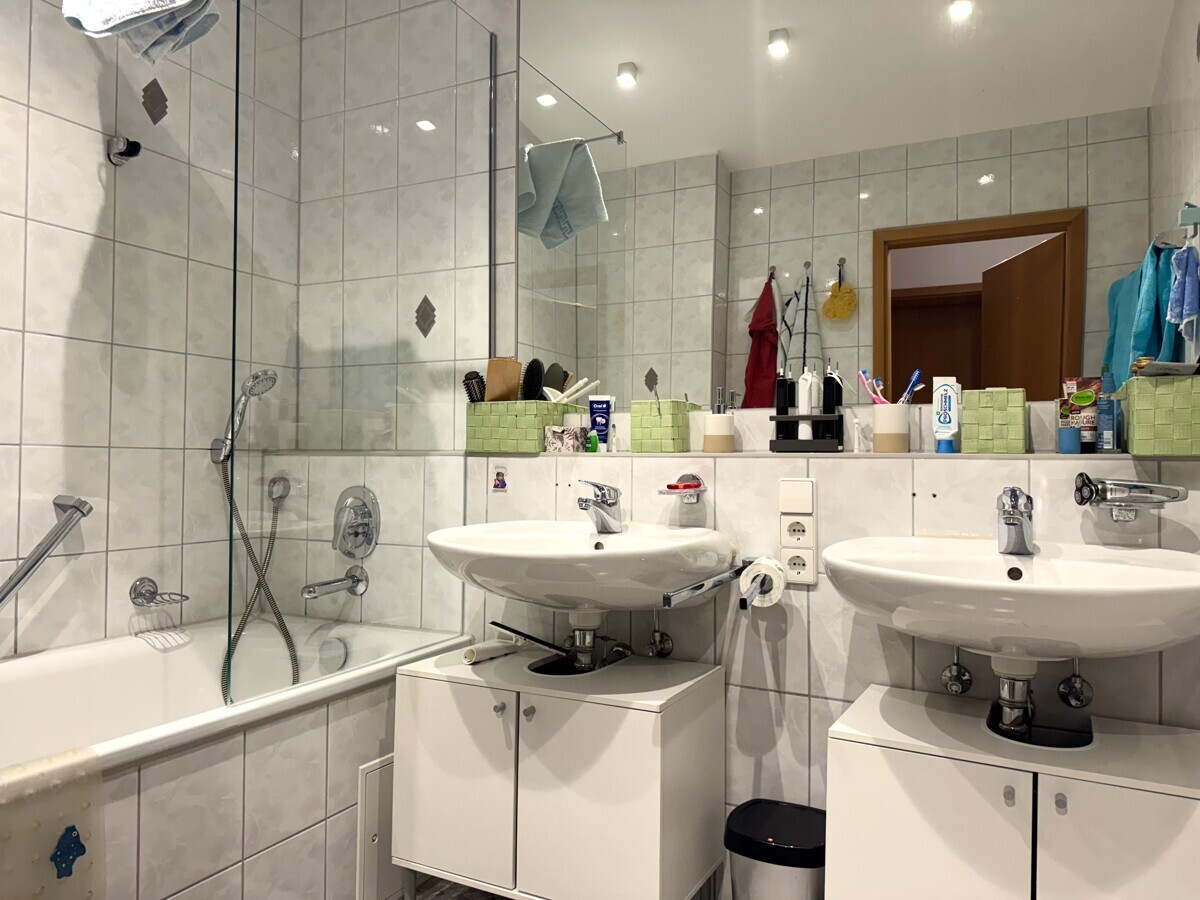 Über den zentralen Flur erreichen Sie das geräumige Schlafzimmer, das innenliegende Badezimmer sowie ein separates WC. Das zeitlos geflieste Badezimmer ist mit einer Badewanne inklusive moderner Duschabtrennung, zwei Waschbecken und einem großzügigen Spiegel ausgestattet. Die durchdachte Raumaufteilung sorgt für einen harmonischen und praktischen Grundriss.