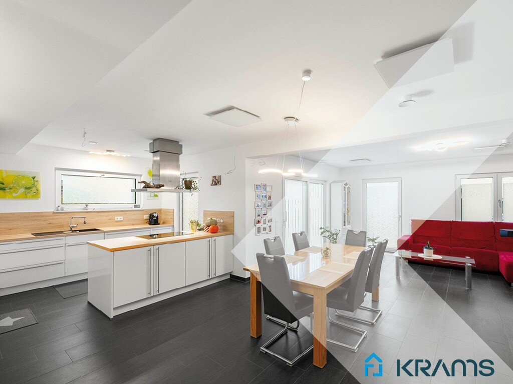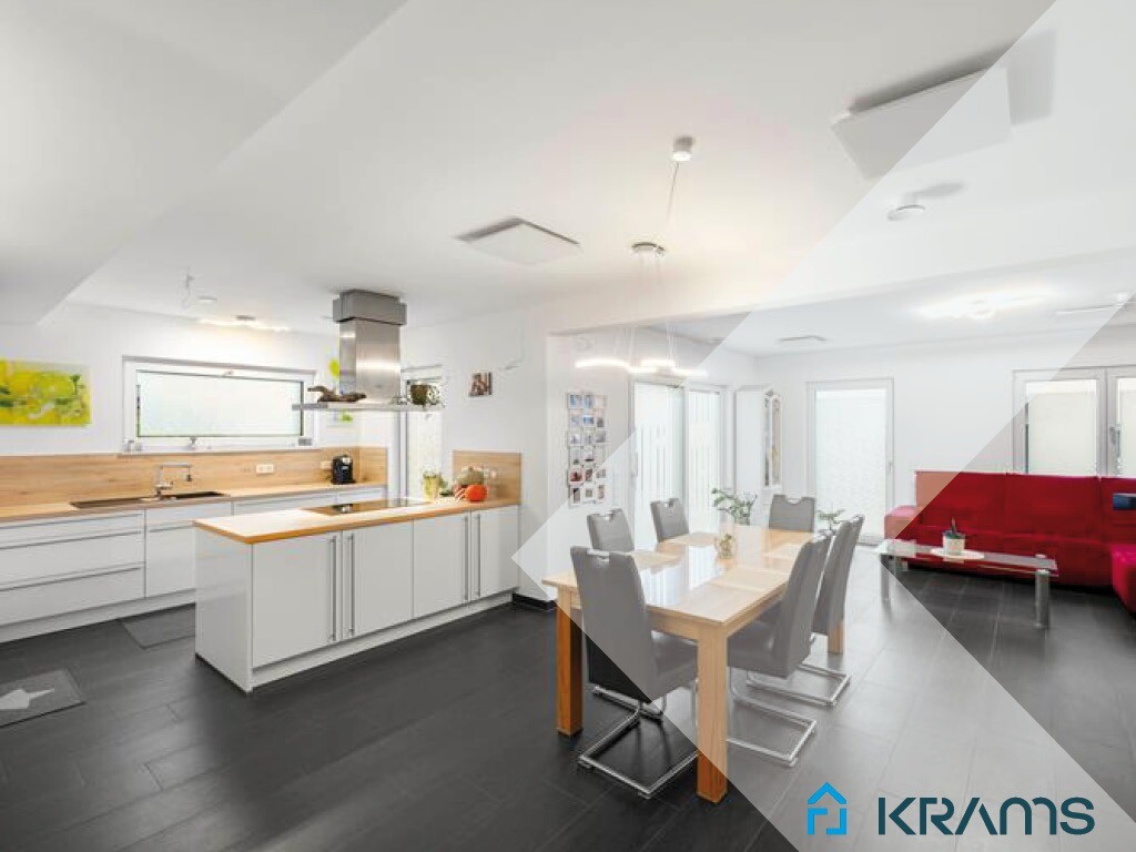 Der offene Wohn- und Essbereich mit bodentiefen Fenstern schafft Licht, Luft und Lebensqualität. Hier ist Platz für gemeinsame Abende, lange Gespräche und echte Familienmomente. Die offene Küche wird ganz selbstverständlich zum Mittelpunkt – kochen, lachen, erzählen, zusammen sein.