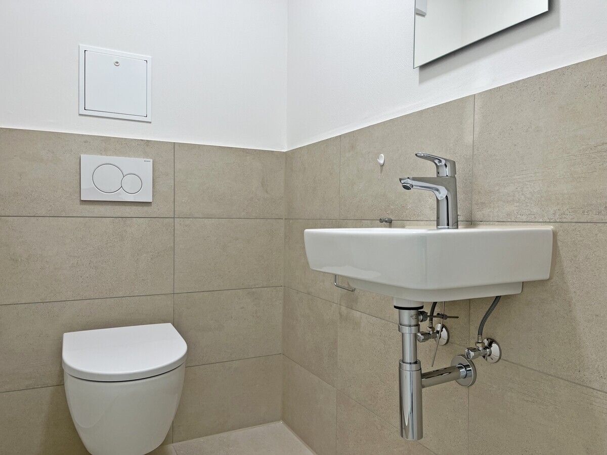 Das modern ausgestattete Badezimmer mit großzügiger Dusche sorgt für Komfort im Alltag. Ergänzt wird das Raumangebot durch ein separates Gäste-WC, einen praktischen Abstellraum sowie ein eigenes Kellerabteil mit zusätzlicher Staufläche.