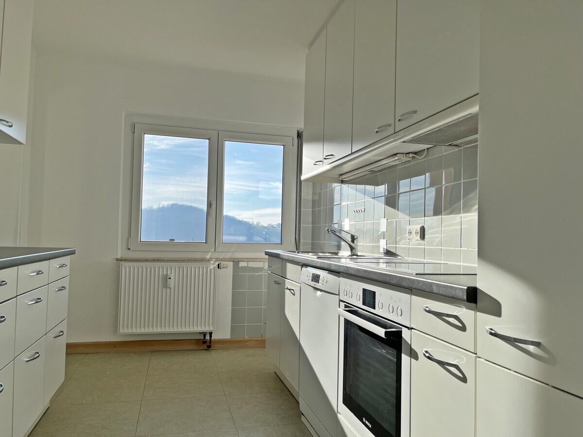 Vom Wohnzimmer aus gelangen Sie direkt auf den sonnigen Südwest-Balkon, der zu entspannten Stunden im Freien einlädt – sei es zum Frühstück oder zum Ausklang des Tages. Die vorhandene Einbauküche ist funktional gestaltet und bietet ausreichend Platz für gemeinsames Kochen.