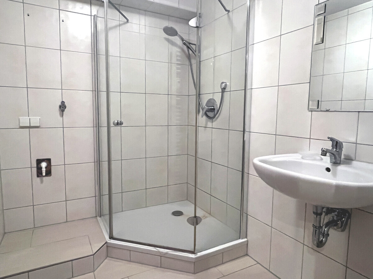 – Innenliegendes Badezimmer mit Dusche, Waschbecken und WM-Anschluss