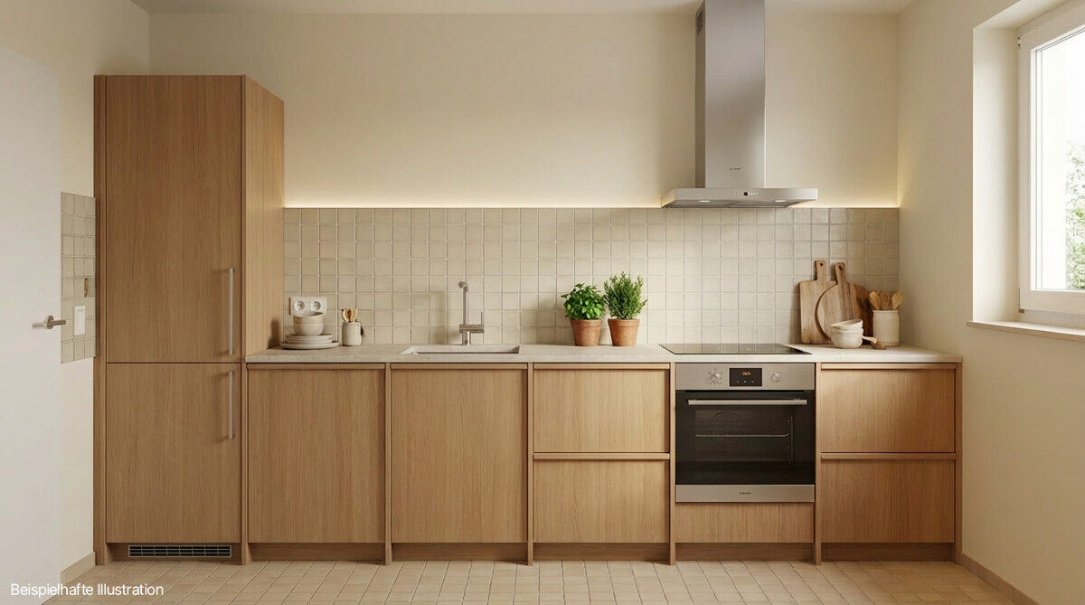 Die separate Küche liegt praktisch angebunden an den Wohnbereich und wird ohne Einbauküche übergeben. Dadurch entsteht volle Gestaltungsfreiheit für eine individuelle Lösung. Das innenliegende Badezimmer ist mit Dusche, Waschbecken und Waschmaschinenanschluss ausgestattet. Ergänzt wird es durch ein separates WC, was den Wohnkomfort im Alltag zusätzlich erhöht.