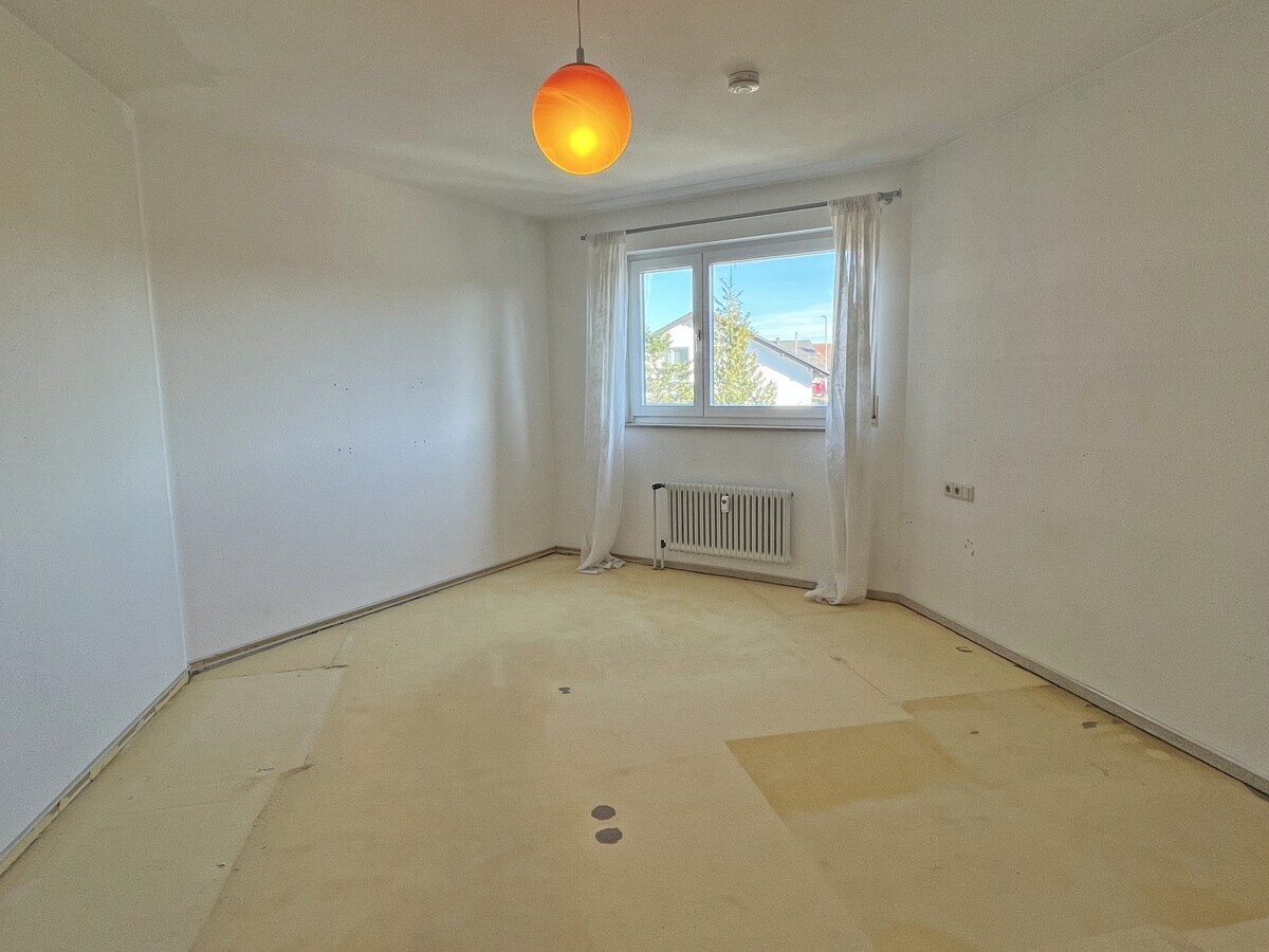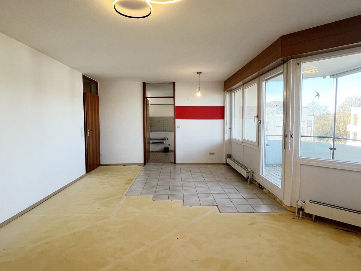 Der Flur empfängt mit vorhandenem Laminatboden und bietet durch integrierte Einbauschränke praktischen Stauraum. In den Wohnräumen wurde der alte Bodenbelag entfernt, eine bewusste Entscheidung, die Raum für neue Materialien lässt. Der Wohn- und Essbereich öffnet sich großzügig und profitiert von seiner besonderen Raumgeometrie, die interessante Stellflächen schafft. Direkt angrenzend liegt der überdachte West-Balkon. Er wirkt wie eine natürliche Erweiterung des Wohnraums und bietet durch die Überdachung eine geschützte Aufenthaltsqualität.