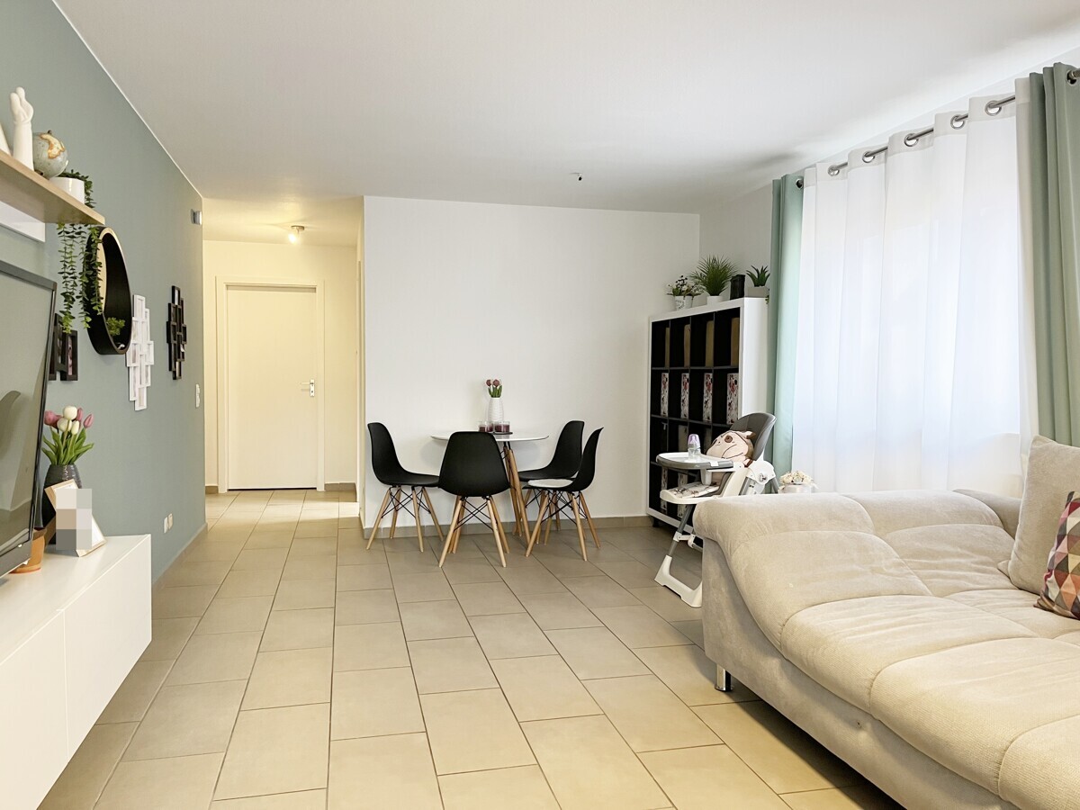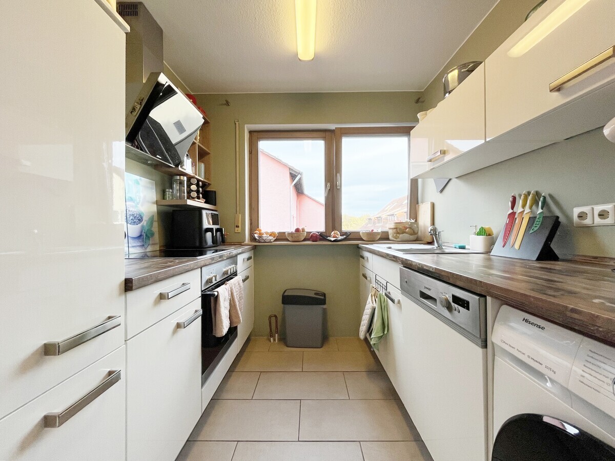 Der helle Wohnbereich öffnet sich zum überdachten Balkon, der zum Verweilen an der frischen Luft einlädt und einen angenehmen Blick ins Grüne bietet. Die gut geschnittene Küche fügt sich harmonisch in das stimmige Gesamtbild ein und schafft Raum für kreative Kochmomente. Schlafzimmer, Wohnraum, Küche und Bad sind ideal aufgeteilt – für ein Wohngefühl, dass Komfort und Funktionalität vereint.
